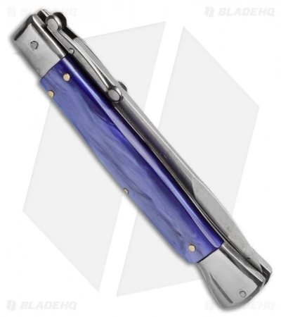This 9″ Italian Stiletto from AKC comes in the swinguard style with a blue pearlex handle and a bayonet blade. AKC specializes in collectible Italian stilettos made with traditional knife-making techniques. This 9″ Swinguard model has a pearlex handle with a sturdy stainless steel liner. Brass pins add a classic finishing touch to the design. The blade comes in a bayonet style with a plain edge and a satin finish. Add classic Italian style to your collection with the AKC 9″ Swinguard stiletto.
