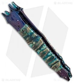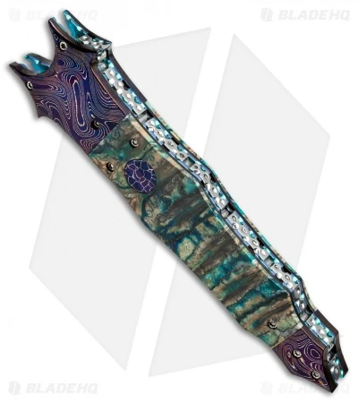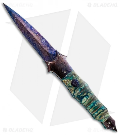 This prototype custom Diablo automatic knife was hand-made by Cory Vallotton, and is the first of its kind. It has a Chad Nichols “Boomerang” Damascus blade and “Boomerang” bolsters. The handle features Green Mammoth Molar scales, green anodized titanium liners and a stainless steel backspacer. The liners and backspacer are filed, adding an elegant touch and texture to the knife. The Diablo comes in a padded zipper pouch with a certificate of authenticity, signed by Cory Vallotton.