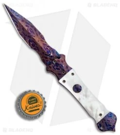 This custom Mini Eos is hand made by Cory Vallotton and features a Chad Nichols “Virus” Damascus steel blade. The Bertie Rietveld “Dragon Skin” bolsters and firing button complete a Mother of Pearl handle with anodized titanium liners and a blued Damascus back spacer.