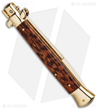 This 11″ Italian Stiletto from Frank B. features classic stiletto style with a snakewood handle and a gold finished dagger blade. Frank B creates some of the finest authentic Italian stilettos available on the market today. This 11″ model has a snakewood handle with gold plated bolsters. Brass pins and liners add a classic touch to the design. Add the premier Italian knife-maker to your collection today with an authentic Italian stiletto from Frank B.