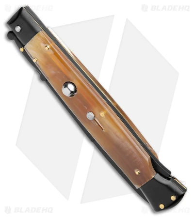 This handsome knife features a flat firing button. There is a sliding safety on the handle to protect against accidental release of the blade. The push button firing is smooth and quick, and the bolster lock is solid. This beautiful combination is a classic, and a must-have for your Frank B collection.