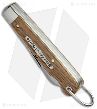 This Tidioute Cutlery Beer Scout Knife features a sheepsfoot blade and a bottle opener that doubles as a flat head screwdriver. The handle is fitted with beer barrel oak scales and a nickel silver bolster.