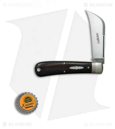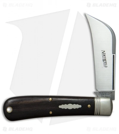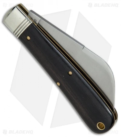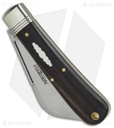 This Pruner pocket knife features a single blade pocket knife design and a Gabon ebony handle. The Northfield UN-X-LD Pruner pocket knife includes a large modified hawkbill style blade. Nickel silver bolsters and brass liners add a classic flair to the design. Brass pins and a nickel silver inlay finish of the impressive Pruner design from GEC Northfield UN-X-LD.