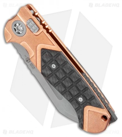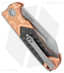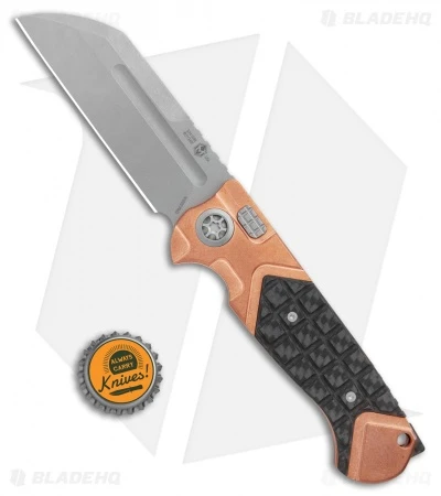ADV and Heretic Knives have teamed up to offer you a fantastic fully automatic version of the Andre De Villiers Butcher. This model is built with a battleworn sheepsfoot blade and a copper handle with frag carbon fiber scales. Item includes a tip-up roller ball clip.