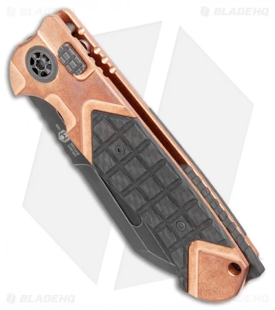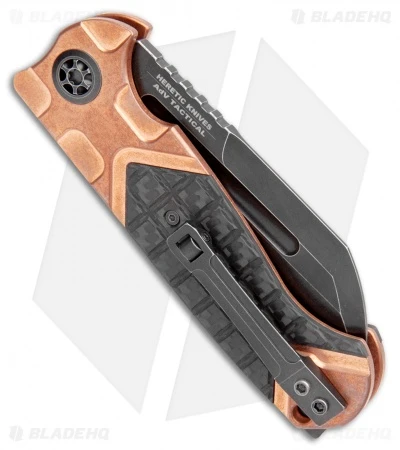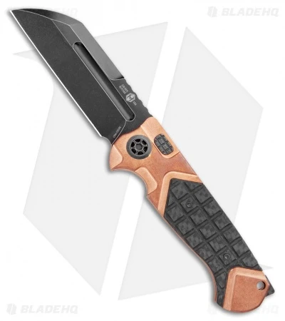 ADV and Heretic Knives have teamed up to offer you a fantastic fully automatic version of the Andre De Villiers Butcher. This model is built with a battleworn black sheepsfoot blade and a copper handle with frag carbon fiber scales. Item includes a tip-up roller ball clip.