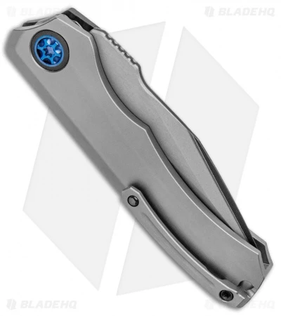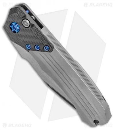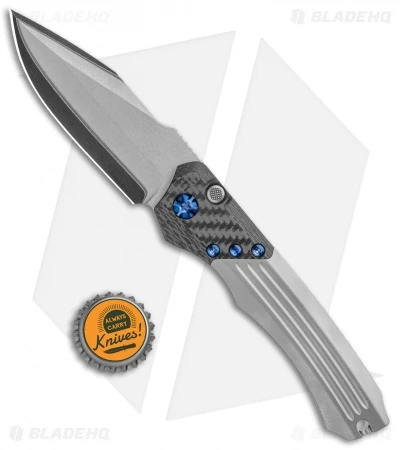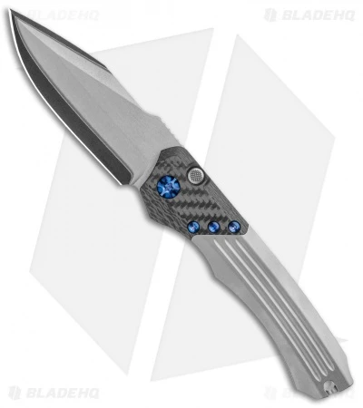 This custom Wraith automatic model features an impressive San Mai Takefu Shiro-2 blade and a vapor blasted titanium handle with a carbon fiber handle and blue anodized hardware.