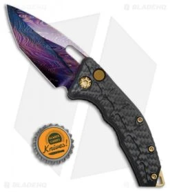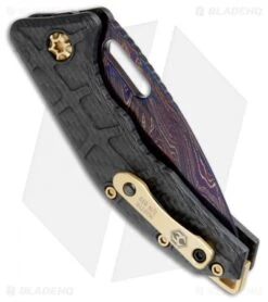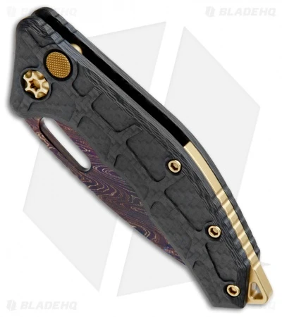 This Martyr Auto model features a blued Damascus tanto blade. It has a carbon fiber handle with a gold TiN coated pocket clip, backspacer, and hardware.