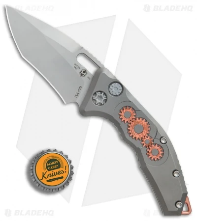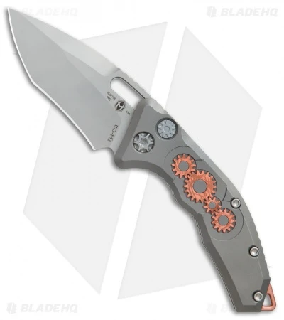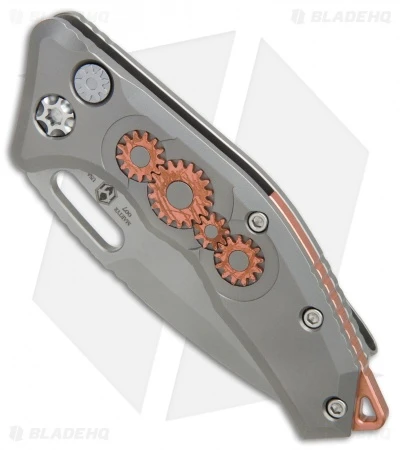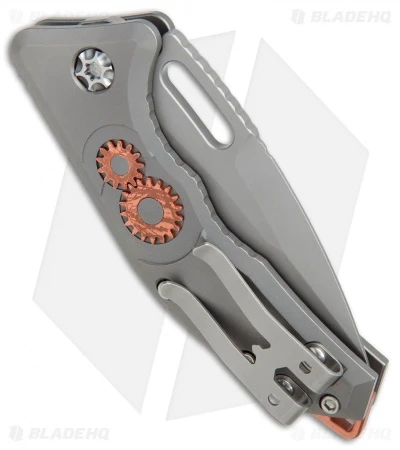 This Martyr Auto model features a Double Blasted recurve tanto blade made from 154CM stainless steel. It has a Double Blasted titanium handle with working copper gears and a solid copper backspacer.