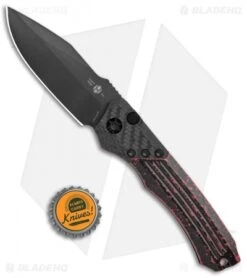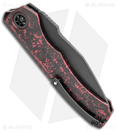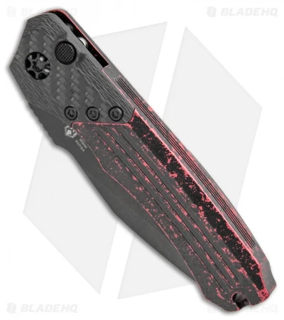 This Wraith automatic model features a black finished blade made from CPM-S35VN stainless steel. It has a red and black, single piece aluminum handle with a carbon fiber bolster and black hardware.