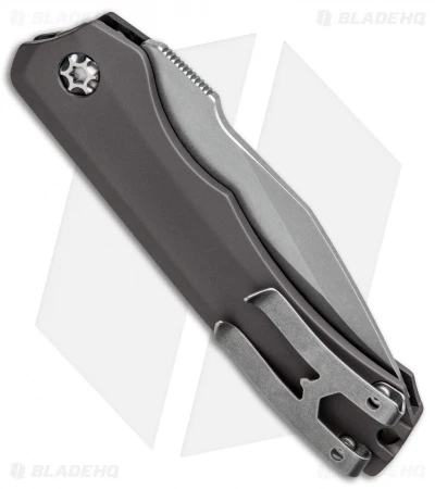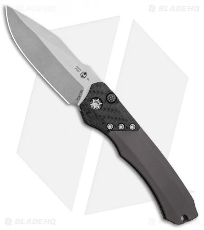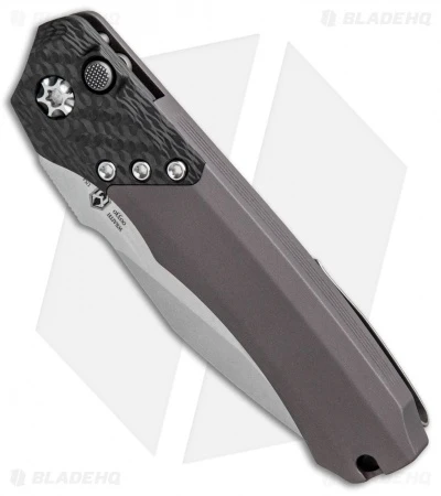 This Wraith automatic model features a two-tone blade made from 154CM stainless steel. It has a gray single piece aluminum handle with a carbon fiber bolster and satin hardware.