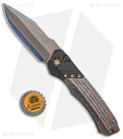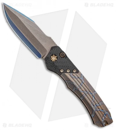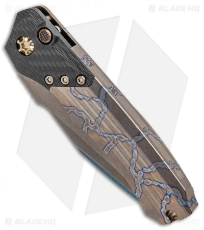 This Wraith automatic model features a san mai blade made . It has a carbon fiber and titanium handle and titanium hardware.