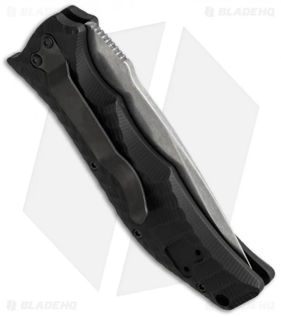 The HTM Gun Hammer automatic knife is modeled after Darrel Ralph’s custom design. The Gunhammer auto has smooth hard-hitting action and solid confidence inspiring lockup. The ergonomic tactical ETAC grip pattern handle is black anodized, 3D machined from aircraft grade aluminum. The Bowie style blade is CPM-S30V stainless steel with a stonewash finish. Comes in a padded black nylon pouch.