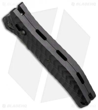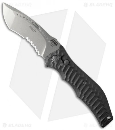 The HTM Gun Hammer automatic knife is modeled after Darrel Ralph’s custom design. The Gunhammer auto has smooth hard-hitting action and solid confidence inspiring lockup. The ergonomic tactical ETAC grip pattern handle is 3D machined from aircraft grade aluminum and black anodized. The Radian style blade is CPM-S30V stainless steel with a non-glare satin finish. Comes in a padded black nylon pouch.