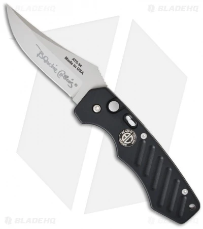 This Blackie Collins Tactical Auto MATCAUTO is a solid performer with hard hitting action and rock solid lockup. The handle is designed to encourage a comfortable, secure grip with finger grooves and a jimped thumb ramp on the spine of the blade. The handle is hard anodized aluminum with a bead blast finished firing button, safety lock and tip-down pocket clip. The drop point ATS-34 stainless steel blade has a plain cutting edge and a bead blast finish. This is an excellent knife that doesn’t disappoint!