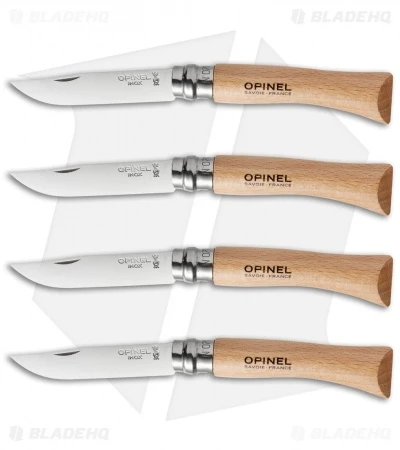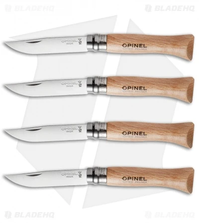 This set of 12 knives includes the No. 6, No. 7, and No. 8 models of the Opinel with stainless steel blades and beech wood handles. There are four of each model.