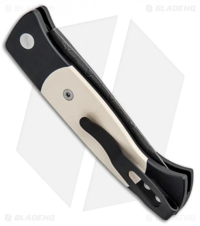 This Custom Tuxedo style Brend 2 automatic knife has a Herringbone damascus pattern blade from Vegas Forge and a black anodized T6 aluminum body with ivory Micarta inserts, satin hardware and a deep carry pocket clip.