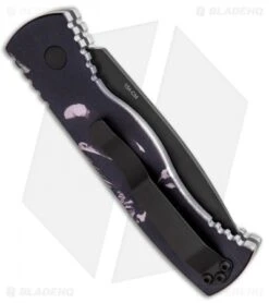 This Peter Kellett print anodized surprise custom TR-2 features a dark purple/black pattern and a Bruce Shaw designed sterling skull inlay. The knife is outfitted with satin finished hardware and a pearl inlay push button. It comes equipped with a black coated 154CM stainless steel blade.