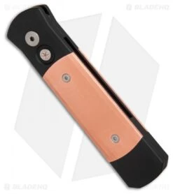 This custom limited edition Godson from Pro-Tech features a black aluminum frame with solid copper inlays on the front and back. It comes equipped with a stainless Damascus blade and a satin finished pocket clip.
