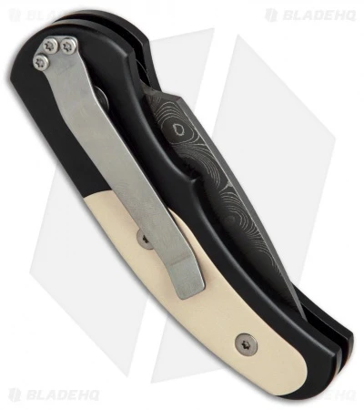 The 4451-D J4 Runt “Tuxedo” features a black anodized aluminum handle with polished Ivory Micarta inlays and a matching push button. The blade is stainless Chad Nichols Damascus steel with a plain edge. Includes a tip-down carry titanium pocket clip. Pictured above is the actual knife for sale!