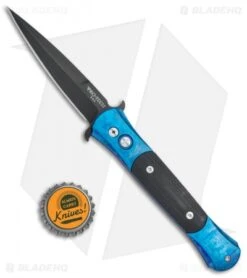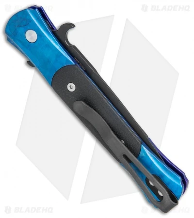 This Don knife features a black finished blade and a blue jazz anodized aluminum handle with black G-10 inlays. The firing button and hardware are satin finished.