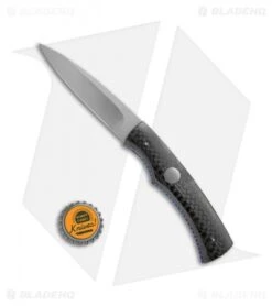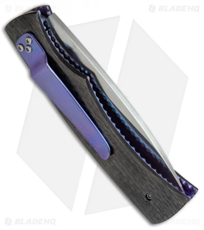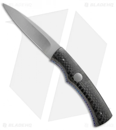This custom Hunter automatic knife was hand-made by Rainy Vallotton. It has a satin finished blade made from premium stainless steel. The handle features carbon fiber scales, purple anodized titanium liners and a stainless steel backspacer. The liners and backspacer are filed, adding a nice touch and texture to the knife.