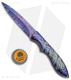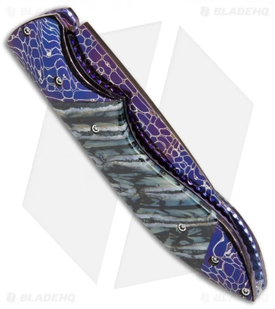 This custom Mini Wasp was hand made by Rainy Vallotton and features a Chad Nichols “Lizard Skin” Damascus blade & matching Damascus bolsters & firing button. The handle is green mammoth molar and the liners are anodized titanium with a stainless steel backspacer. The knife features file work on the liners as well.