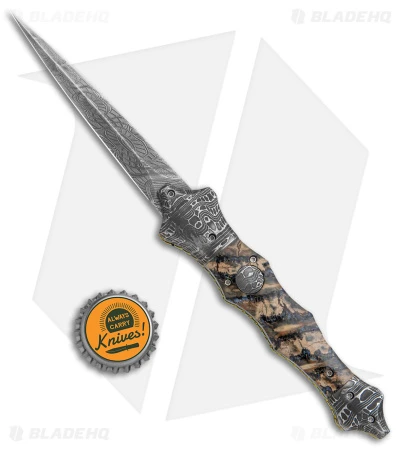 This custom Small Saber Automatic knife designed by Rainy Vallotton is from Blade Show East 2022. It has mammoth scales with Chad Nichols lizard steel bolsters and a Mike Norris Mosaic Damascus steel blade.