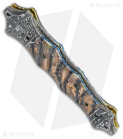 This Small Saber is forged from Mike Norris Mosaic Damascus steel, the rippling pattern narrowing perfectly with the tapering blade. Beautifully complimenting this blade are the Chad Nichols “lizard steel” bolsters and plunge lock. The scales are made from a striated beige, brown, and black mammoth material that contains just a touch of blue—which is reflected in the blue accent running along the brass liners and liner lock. This exquisite knife is truly a work of art that would be the making of any collection.