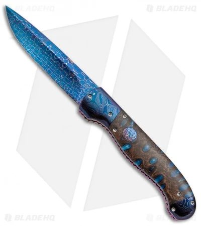 This custom Titan automatic knife offers a fine hand-made design by Rainy Vallotton. It has a Chad Nichols “Lizard Skin” Damascus blade and “Boomerang” bolsters. The handle features highly unique blue resin burl scales, purple anodized titanium liners and a stainless steel backspacer. The liners and backspacer are filed, adding a nice touch and texture to the knife. This Titan model is equipped with a floating titanium back spring for fast and reliable opening action.