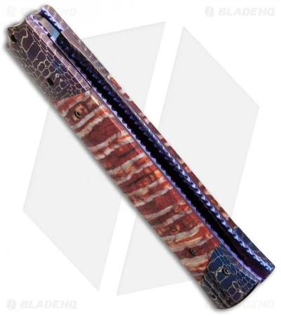 This custom Vendetta is hand made by Rainy Vallotton and features a Chad Nichols “Cheetah” Damascus steel blade along with “Fade” bolsters and firing button. The handles are mammoth molar with titanium liners and a polished 440C stainless steel back spacer. The knife features file work on the liners and back spacer.