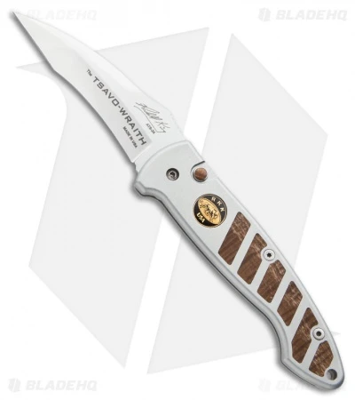 Randall King’s Tsavo Wraith is a wicked looking knife with stellar automatic action. The ATS-34 steel blade is mirror finished and laser etched with “TSAVO WRAITH, MADE IN THE USA, ATS-34” and a copy of the designer’s signature. The blade comes razor sharp, fires with a nice snap, and locks securely in place. It’s got a good feel in hand.