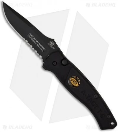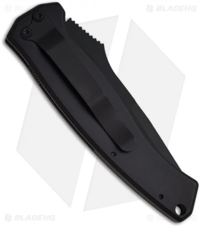 Randall King’s automatic Swift Striker II is a great knife! The CPM-154 stainless steel blade is black finished with a partially serrated edge. The blade comes razor sharp, fires with a nice snap and locks securely into place. The knife body is anodized black T-6 aluminum. It’s got a good feel and we’re quite impressed with the overall quality. There’s a sliding safety on the back that works flawlessly and a pocket clip to make carry easy.