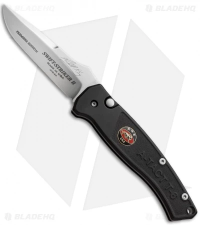 Randall King’s automatic Swift Striker II is a great knife with a super price. The ATS-34 blade is mirror finished and laser etched with “SWIFT STRIKER II, MADE IN THE USA, ATS-34” and has a copy of the designer’s signature. The blade comes razor sharp, fires with a nice snap and locks securely into place. The knife body is anodized black 6061-T6 aluminum. It’s got a good feel and we’re quite impressed with the overall quality.